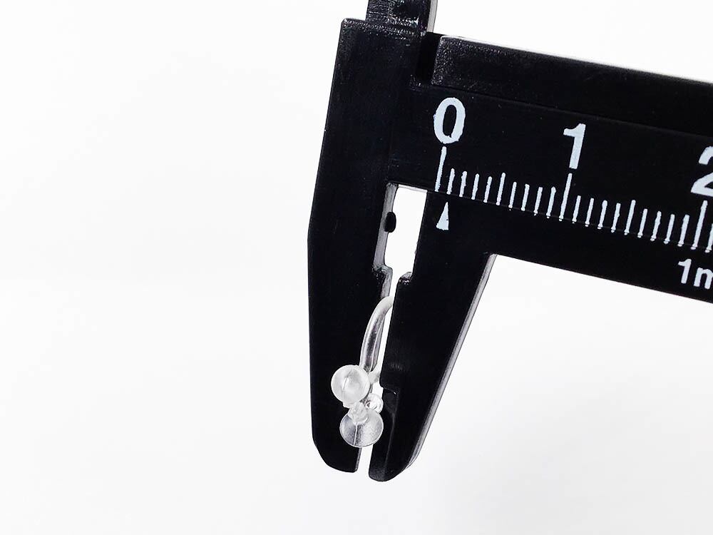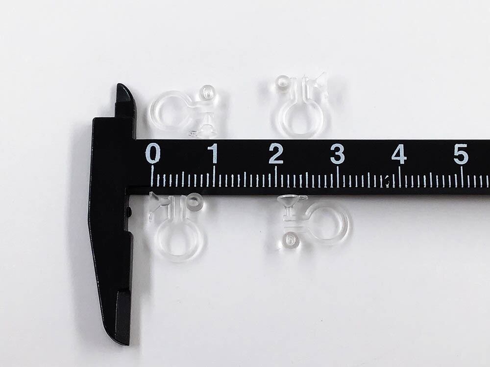 1個サイズ:約11mmx約9mm 内径幅:最小1mm最大:5mm(樹脂製ですので記載以上の開閉も可能です) 球系約3mm お椀型台座径約4mm無い位 カン径約1mm (商品画像に簡易計測画像御座います、簡易ですので誤差は御座いますのでご了承下さい。)