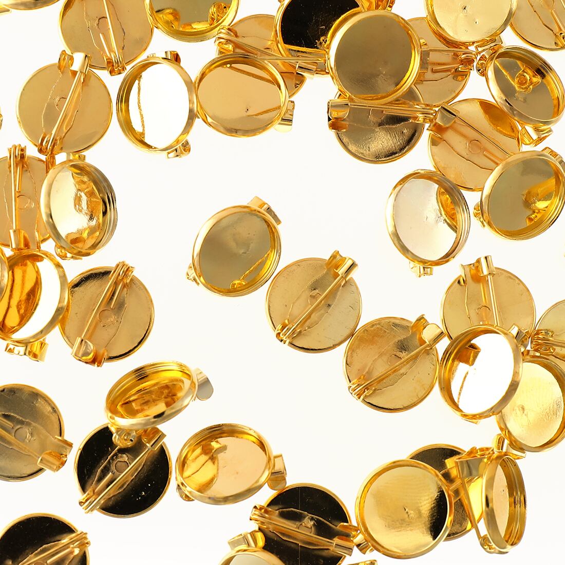 商品名:ブローチピン ミール皿台座付き ゴールド 50個 小さめ 台座内径約12mm ブローチピンパーツ セッティング台座 アクセサリーパーツ