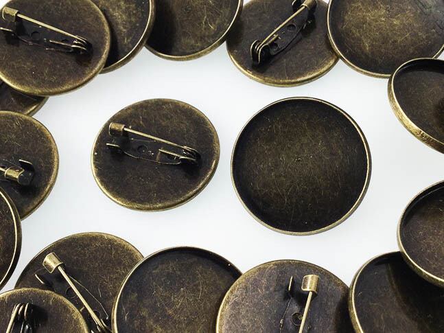 送料無料 ブローチピン 19mm ミール皿 台座付き 20個 金古美 ミール皿【外径約27mm内径約25mm】 アンティーク ゴールド バッジピン コサージュ 金具 アクセサリーパーツ AP0451